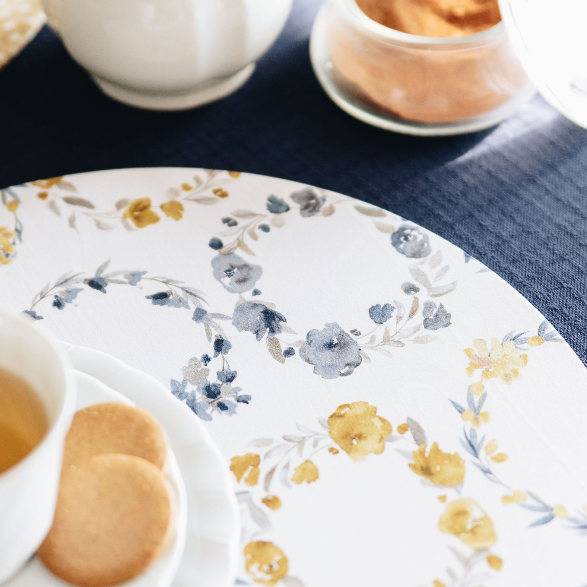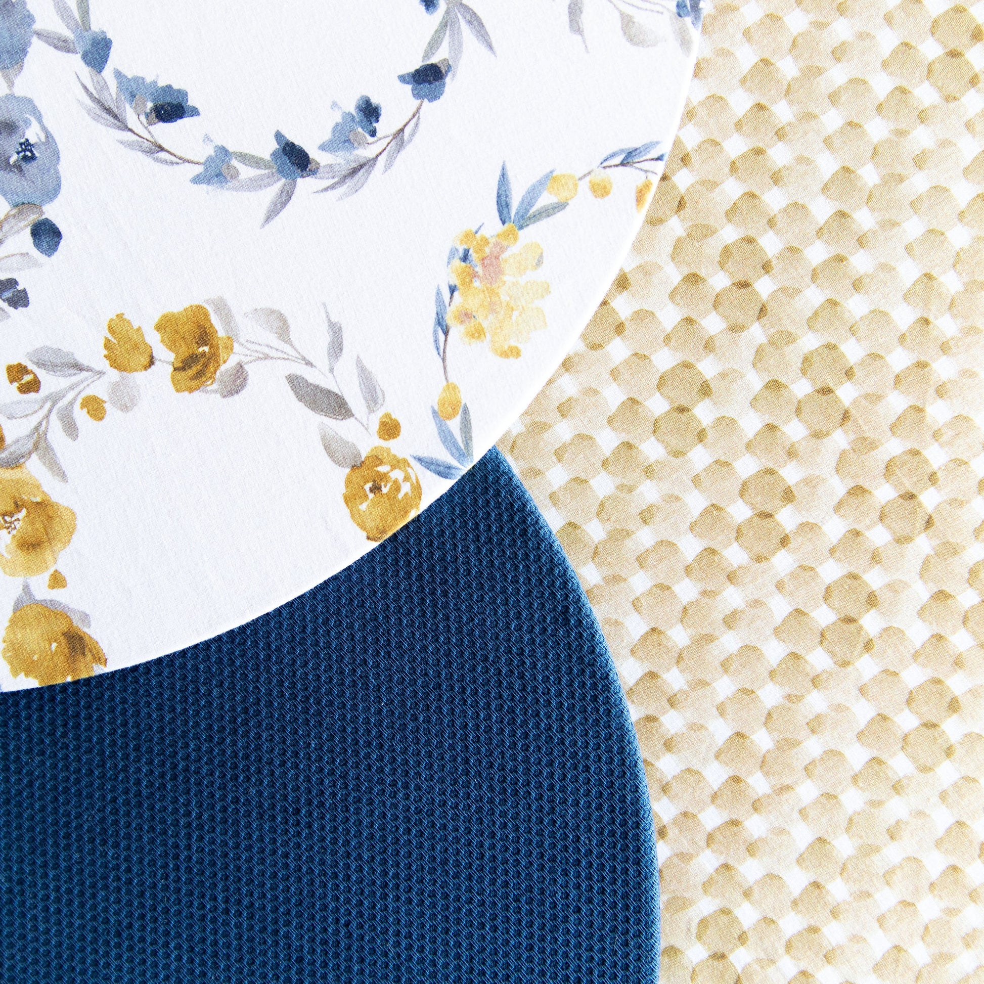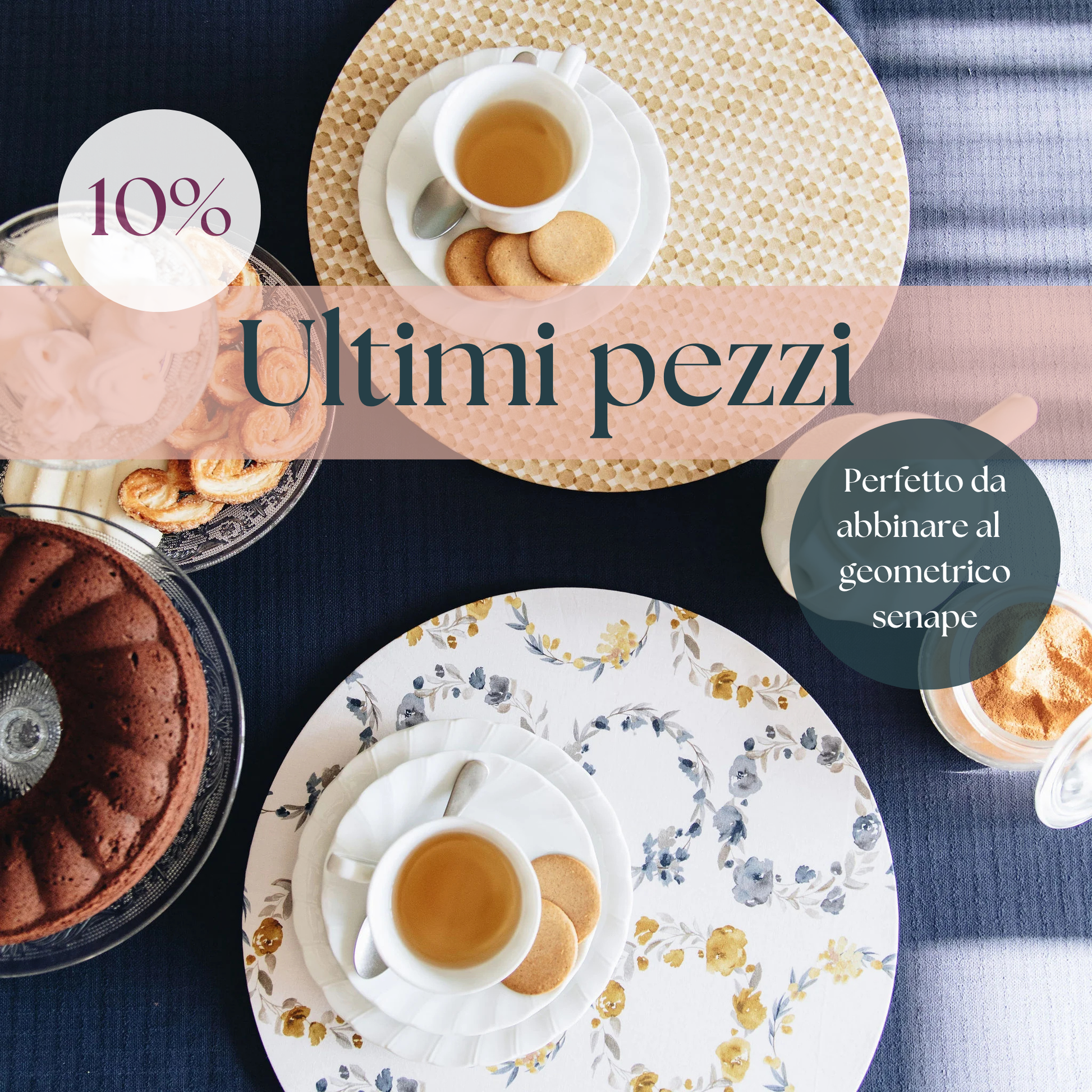 Il set Regina Victoria abbina due tessuti nella nuance del color senape, si possono acquistare solo le singole fodere dello stesso disegno o abbinarle con tovaglie/runner in tinta unita, io ho scelto i toni del blu per far esaltare i disegni dei sottopiatti.