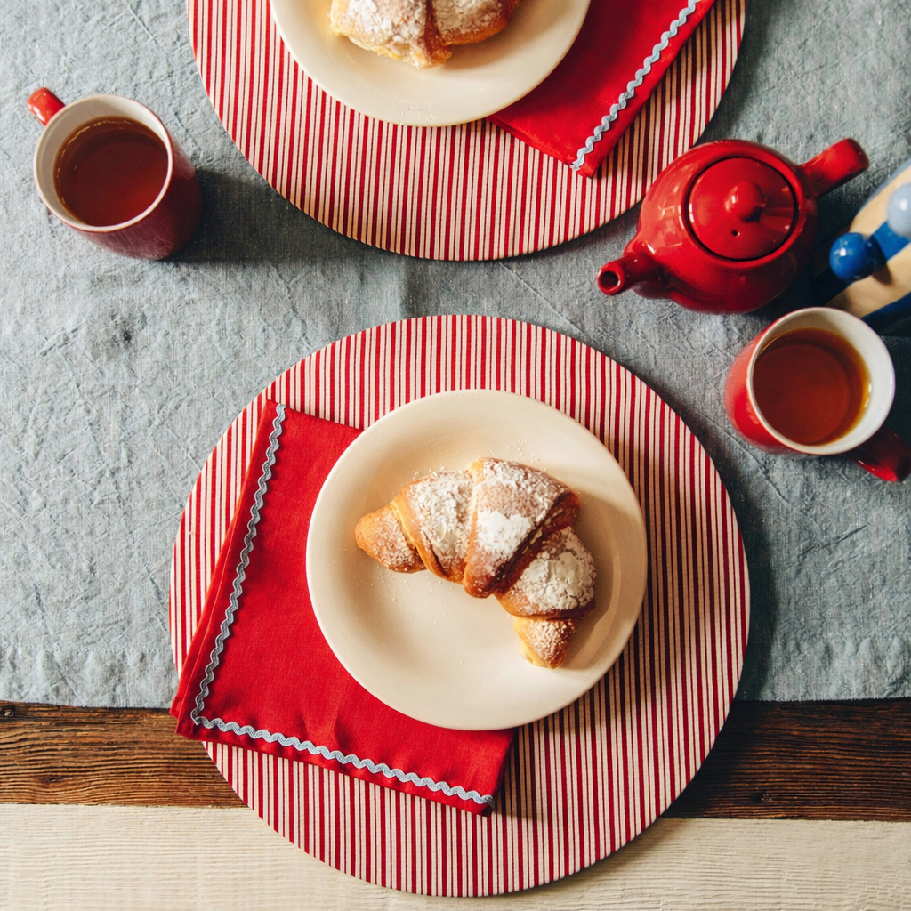 Il sottopiatto sfoderabile a righe rosse e bianche interpreta un’estetica audace e senza tempo, capace di creare ritmo visivo e carattere in ogni mise en place.