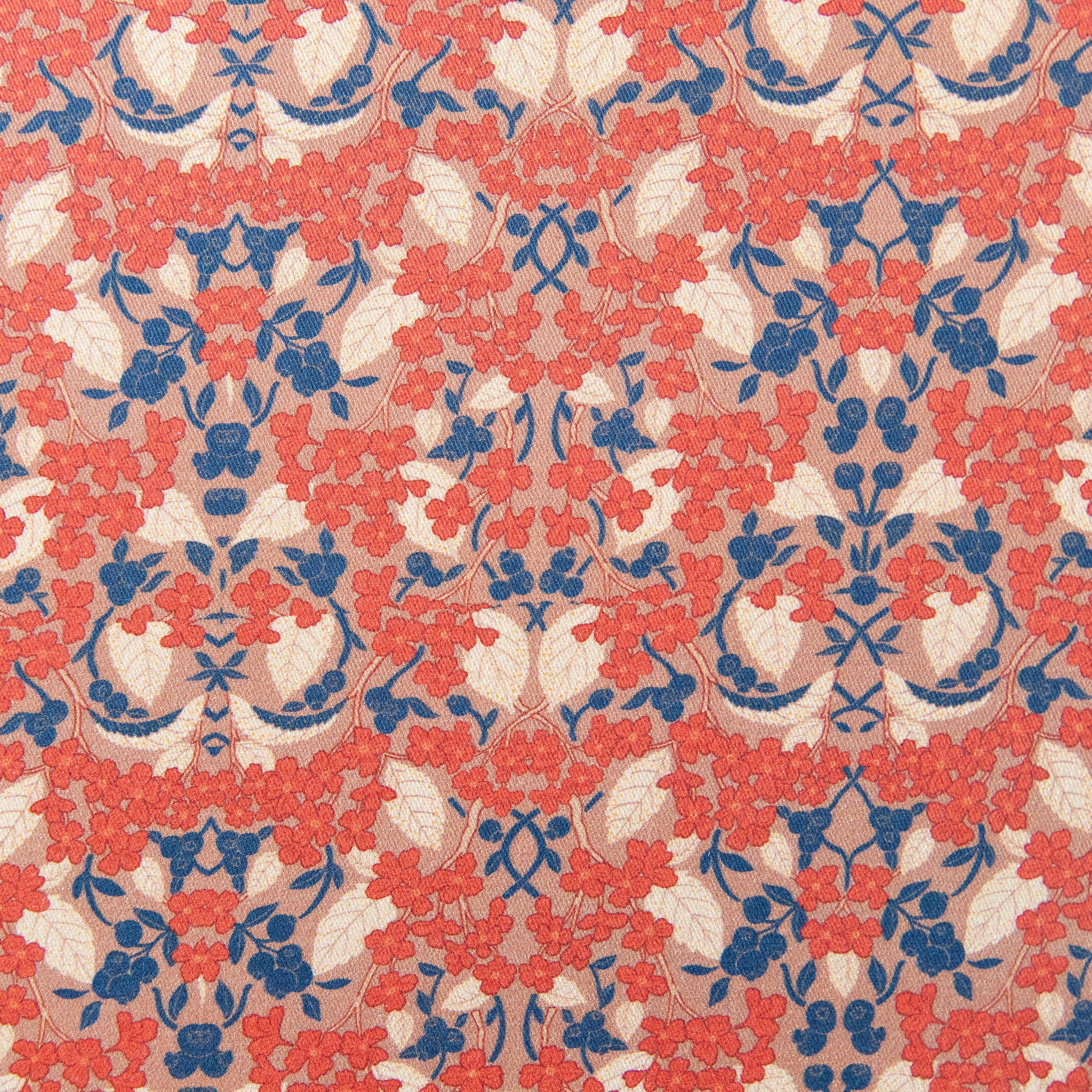 I piccoli motivi color crema e blu/verde sottobosco emergono delicati su uno sfondo di corolle rosso mattone, richiamando il calore e il fascino dei giardini nascosti.