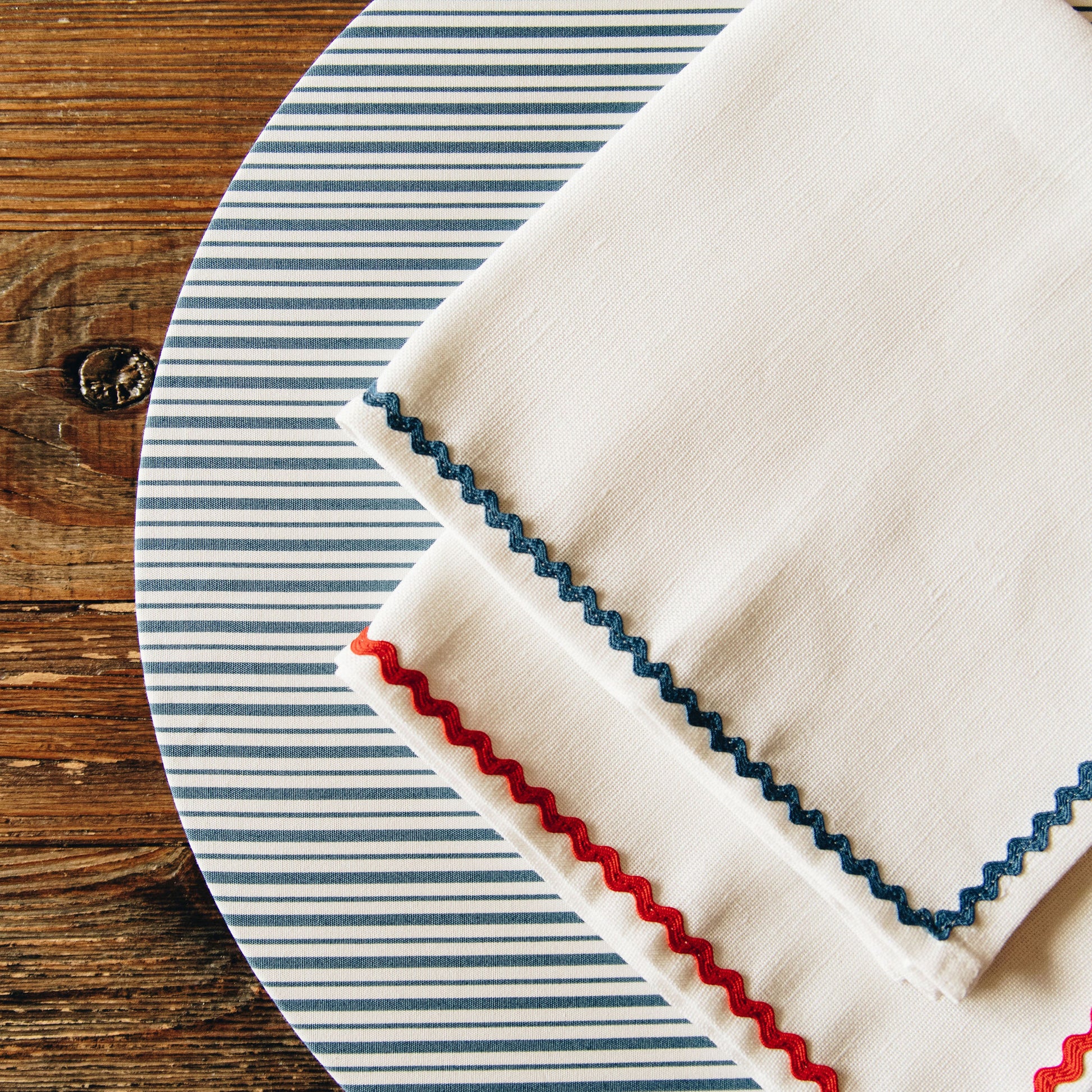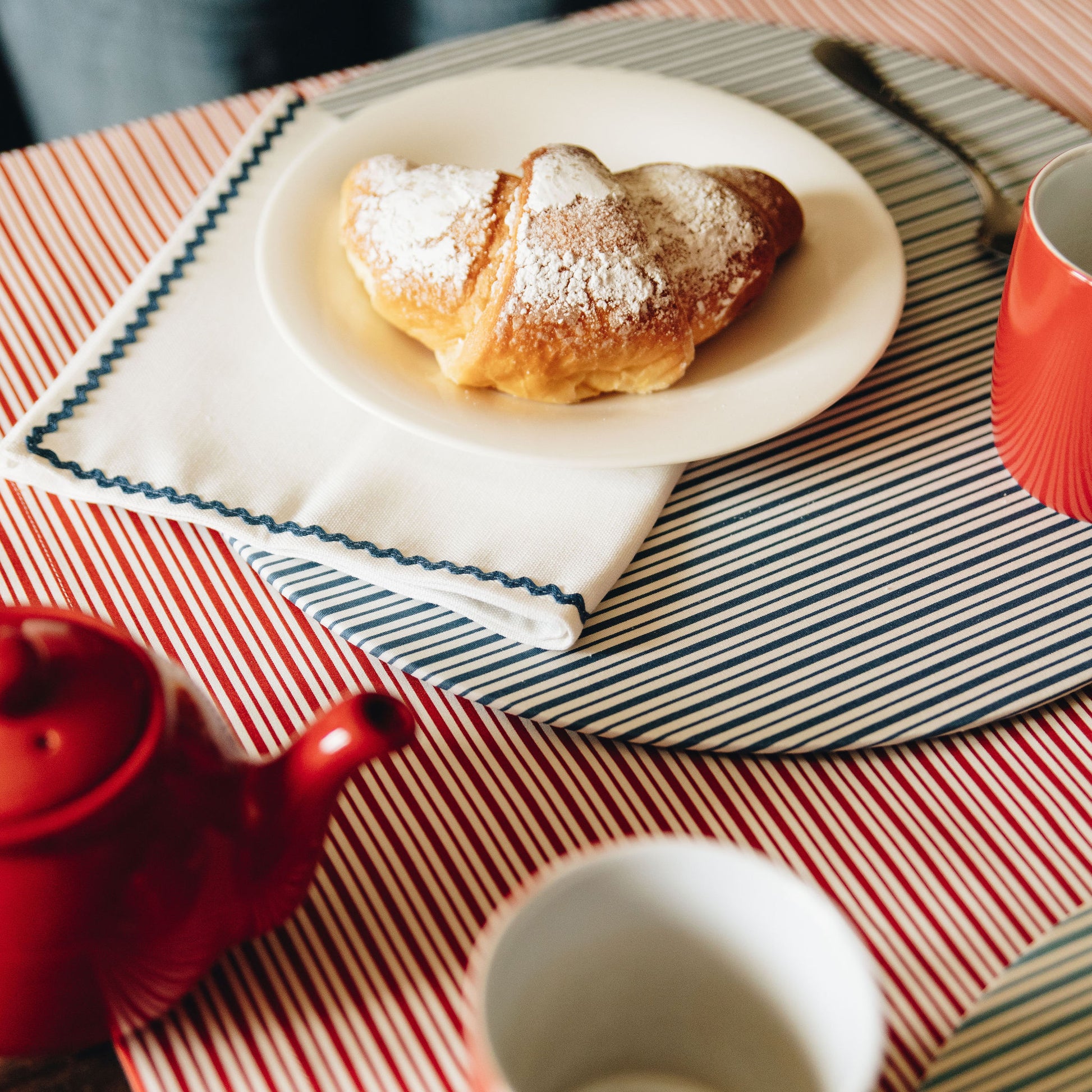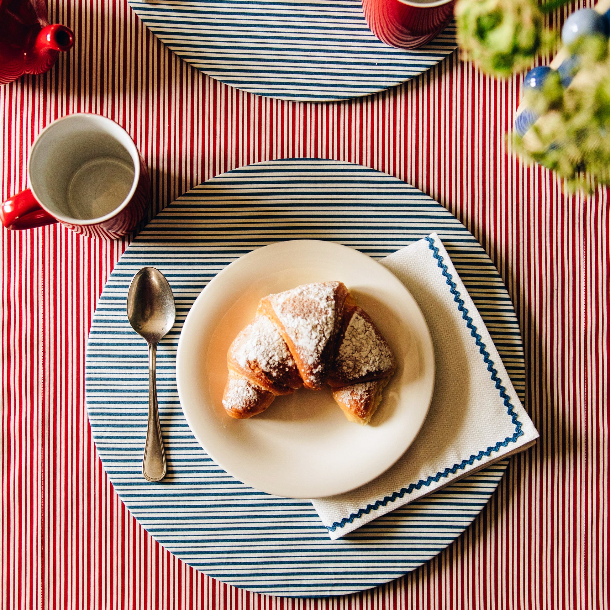 Il sottopiatto sfoderabile a righe blu e bianche Oceano interpreta un’estetica profonda e raffinata, capace di evocare calma, equilibrio e un’eleganza senza tempo.