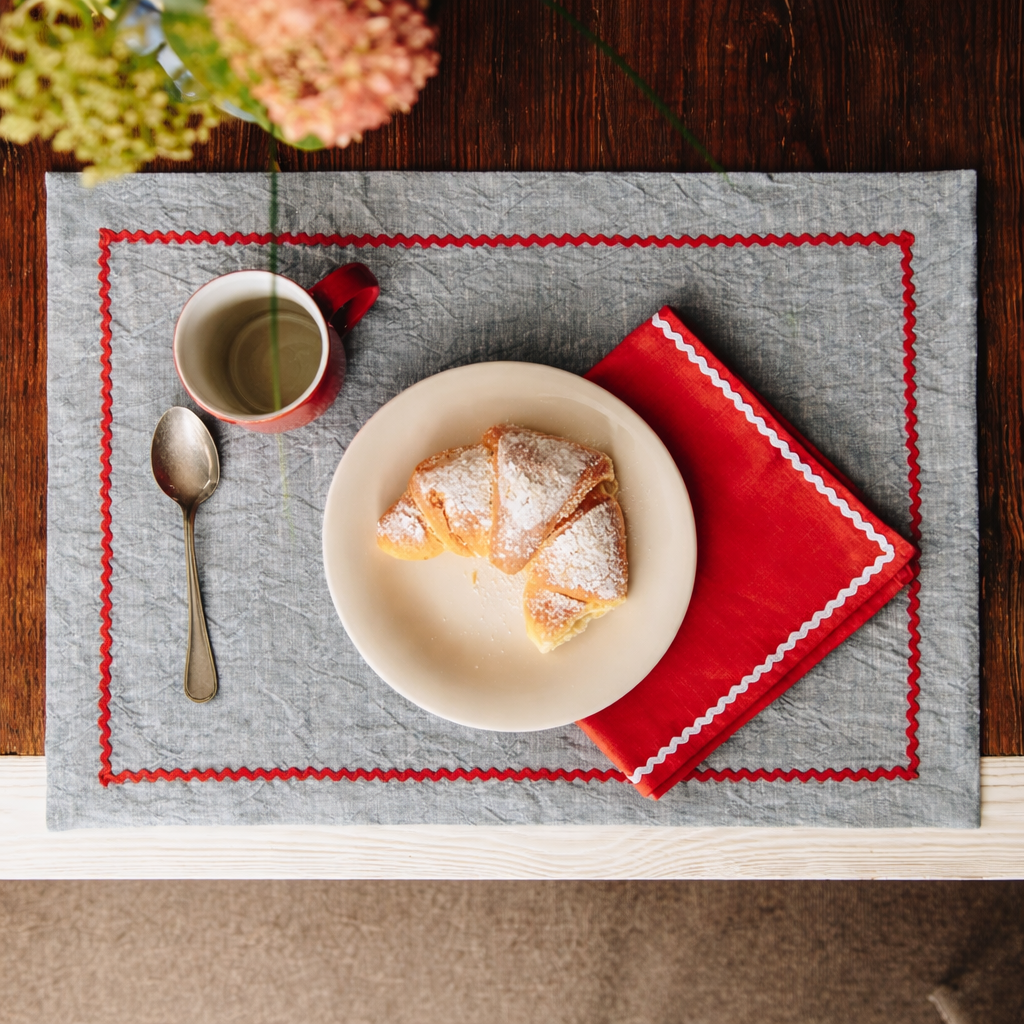 Realizzata in lino e immersa in un delicato azzurro cielo, questa tovaglietta esprime equilibrio e raffinatezza, mentre la serpentina rossa introduce un elemento distintivo capace di catturare l’attenzione e valorizzare l’intera mise en place.